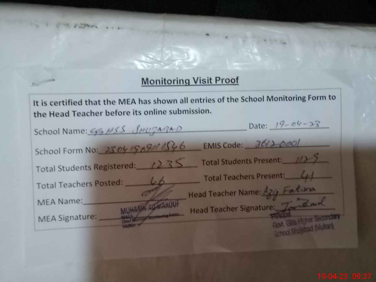 | Attendance Register | Head Teacher | MEA with School | Visit Proof |