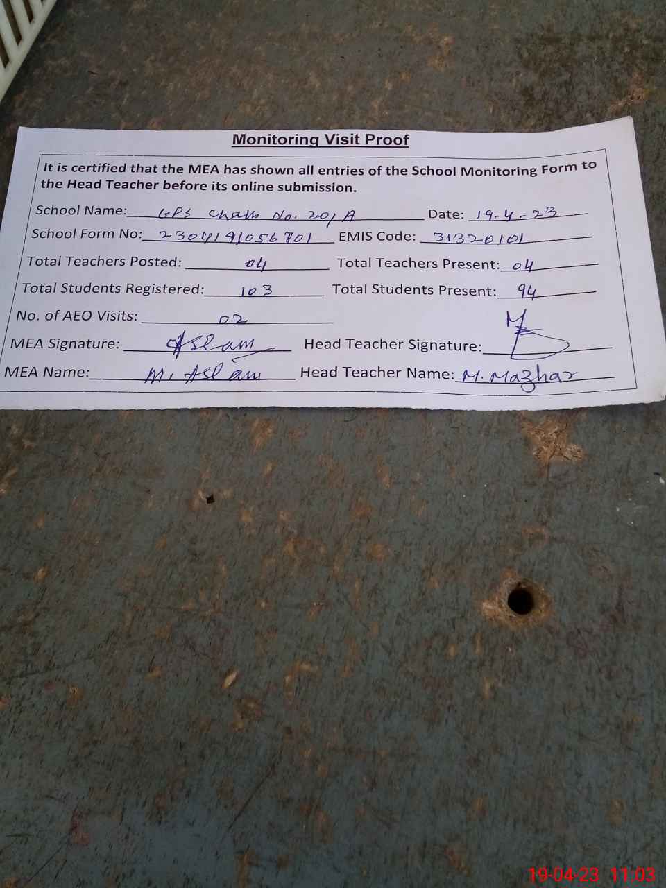 | EMIS Code: 31320101 | Name of School: GPS CHAK 20/A | |||