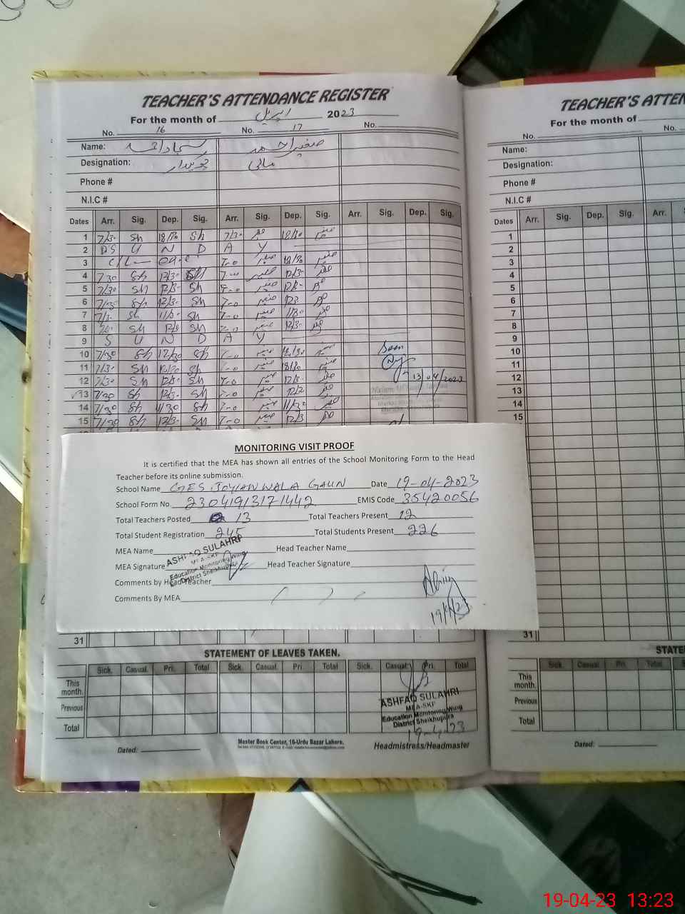 | Attendance Register | Head Teacher | MEA with School | Visit Proof |