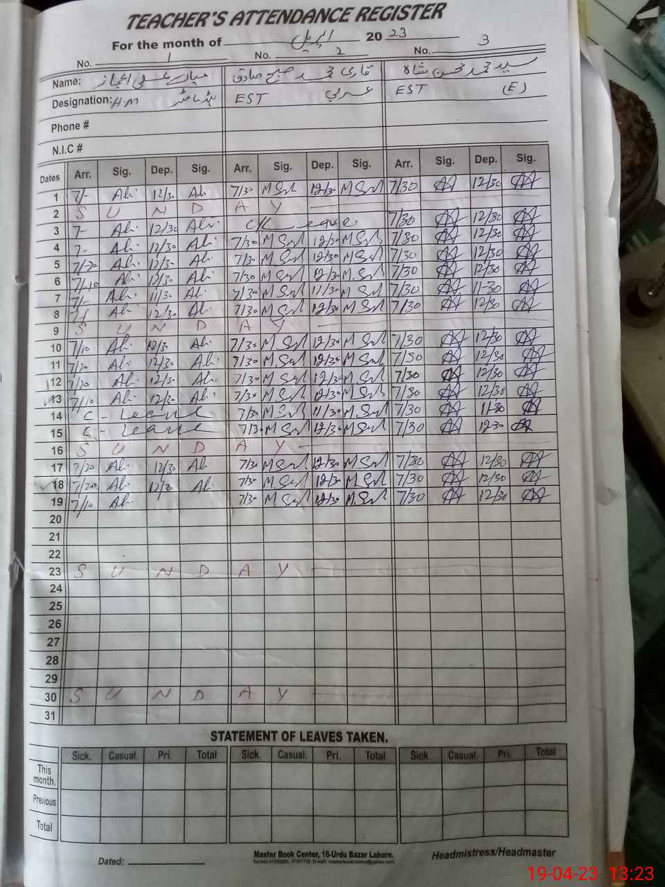 | CNIC | Full Name | Designation | R/C | Absence During Last Calender Month |