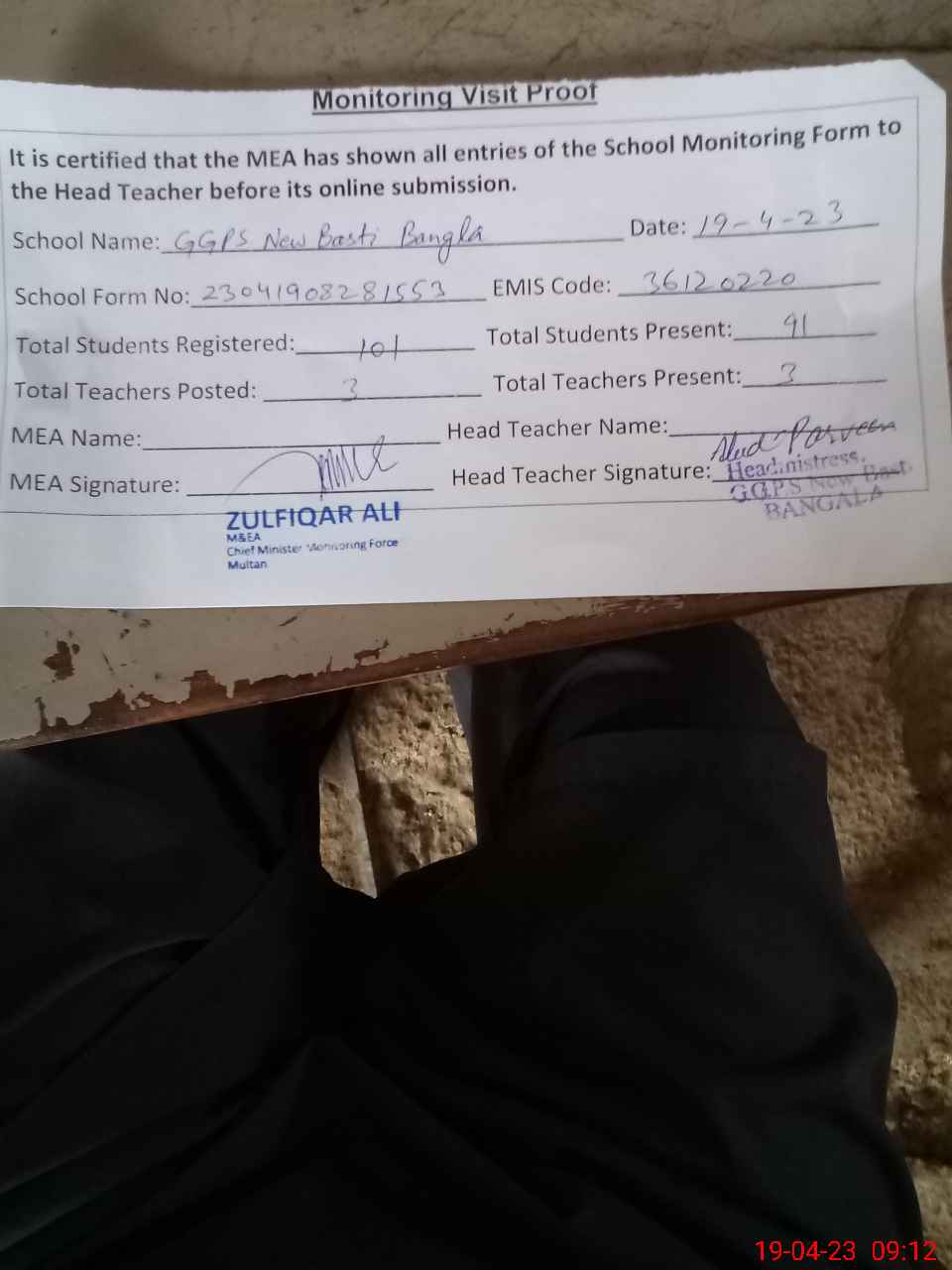 | Monitoring Date: 19-04-2023 | Start Time: 19-04-2023 08:28 AM | End Time: 19-04-2023 09:12 AM | Name of MEA: Zu**** Al**** | |