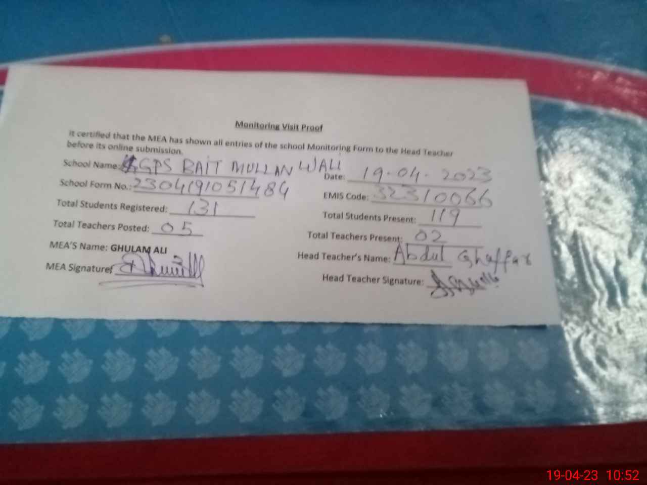 | EMIS Code: 32310066 | Name of School: GPS BAIT MULLAN WALI | |||