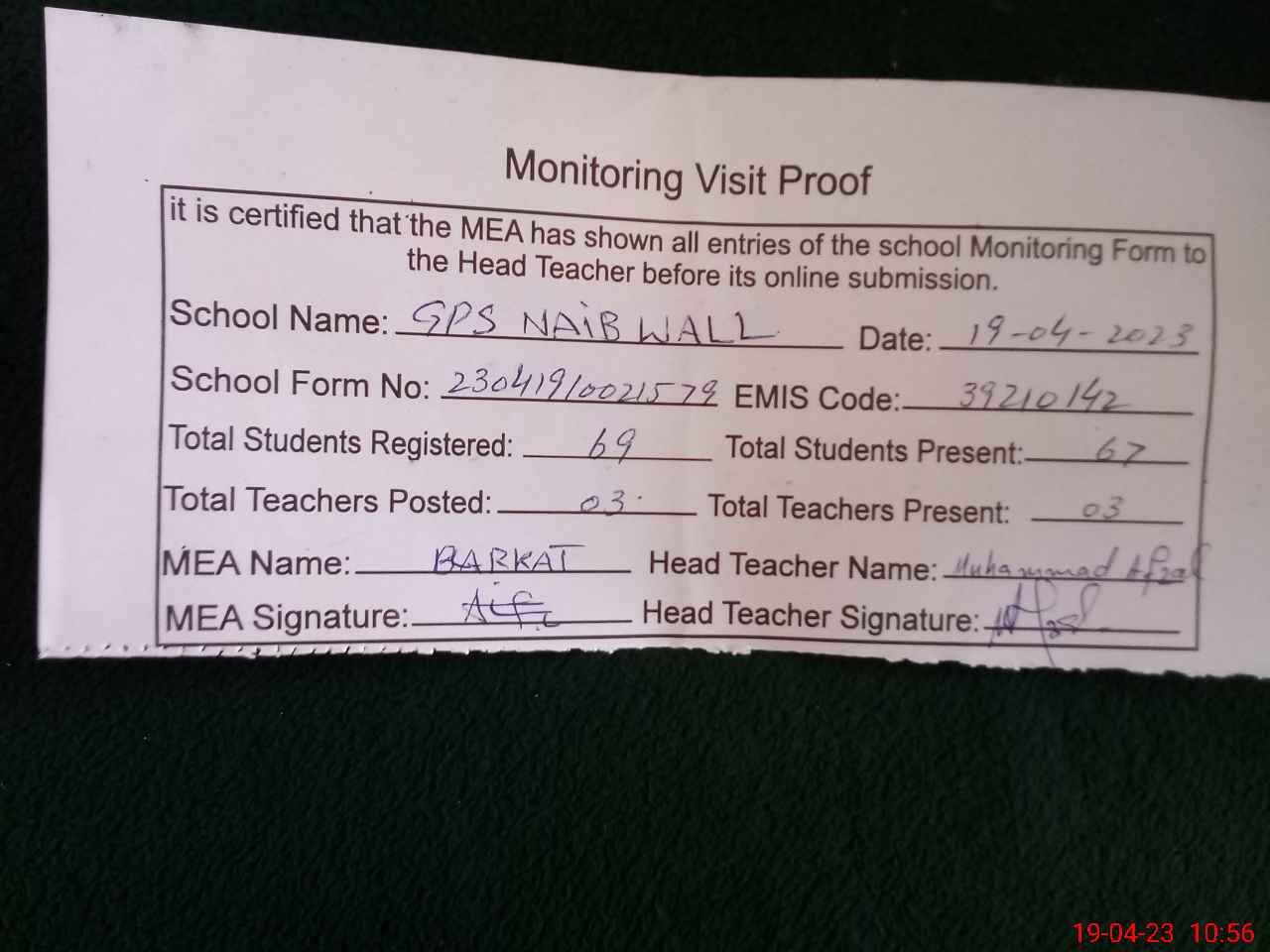 | Attendance Register | Head Teacher | MEA with School | Visit Proof |