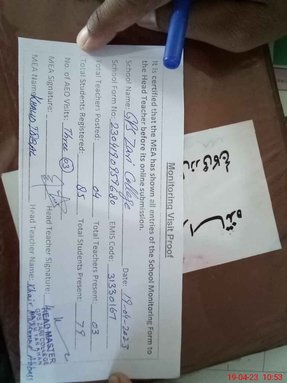 | Attendance Register | Head Teacher | MEA with School | Visit Proof |