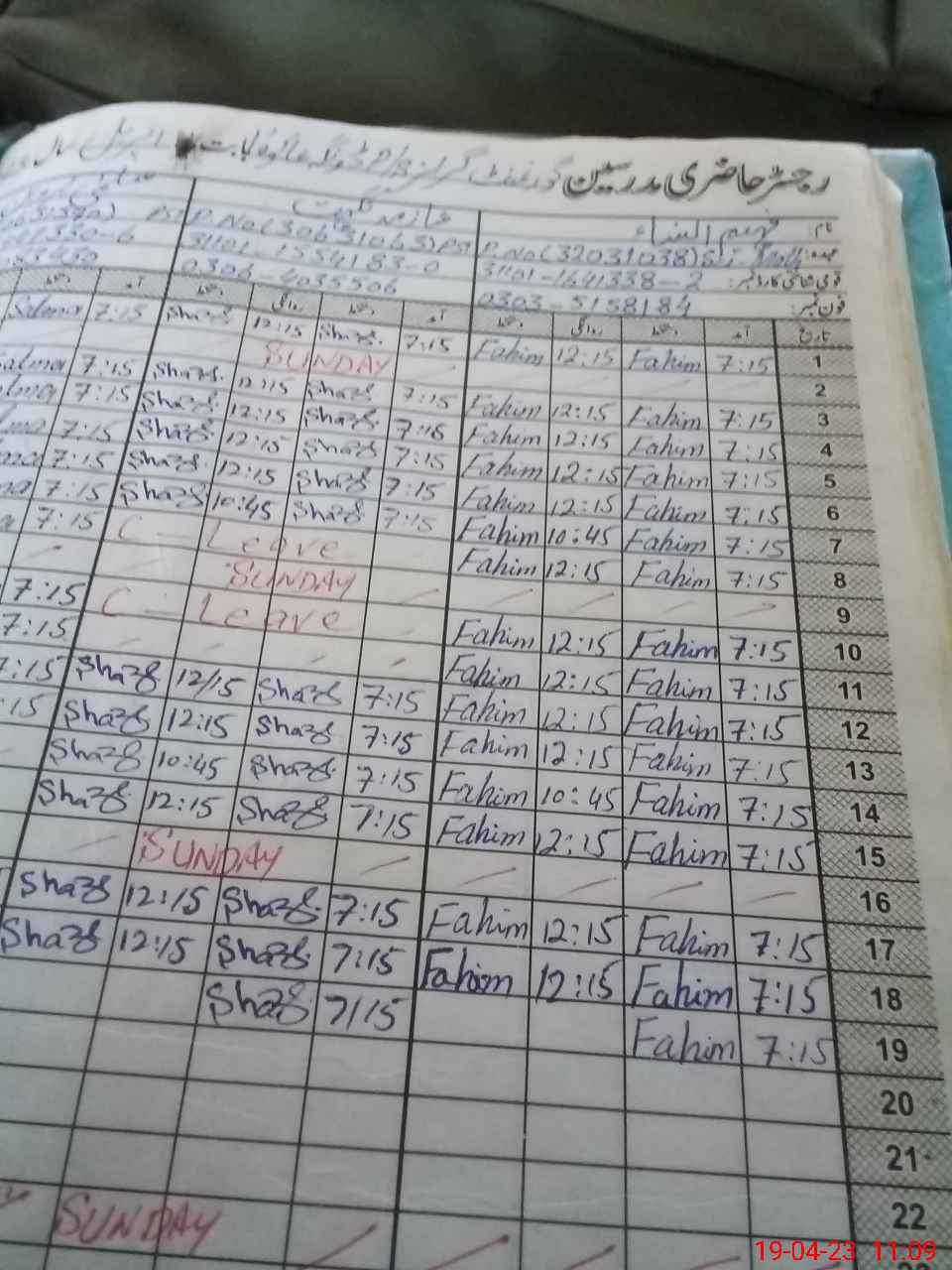 | CNIC | Full Name | Designation | R/C | Absence During Last Calender Month |