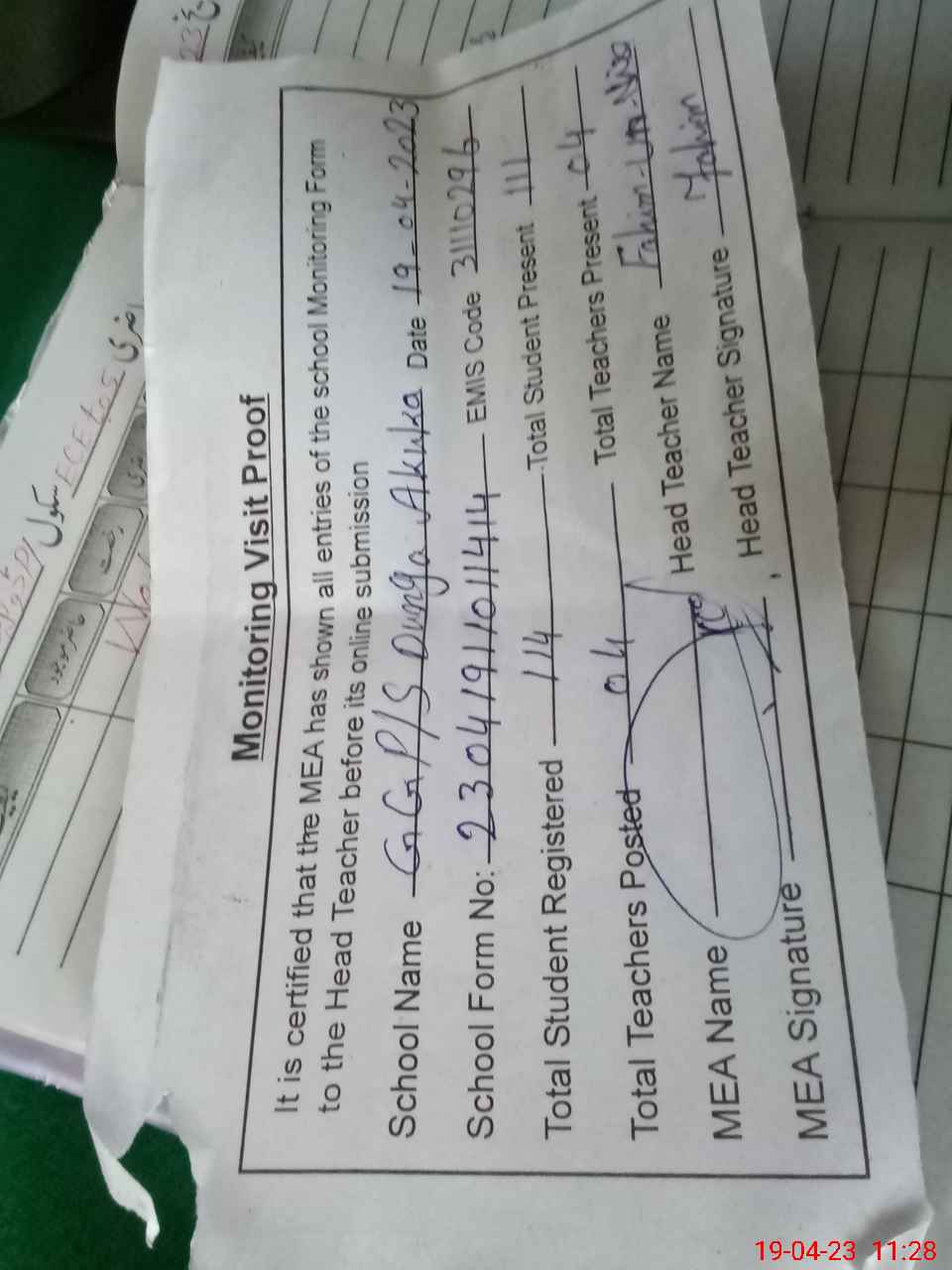 | Attendance Register | Head Teacher | MEA with School | Visit Proof |