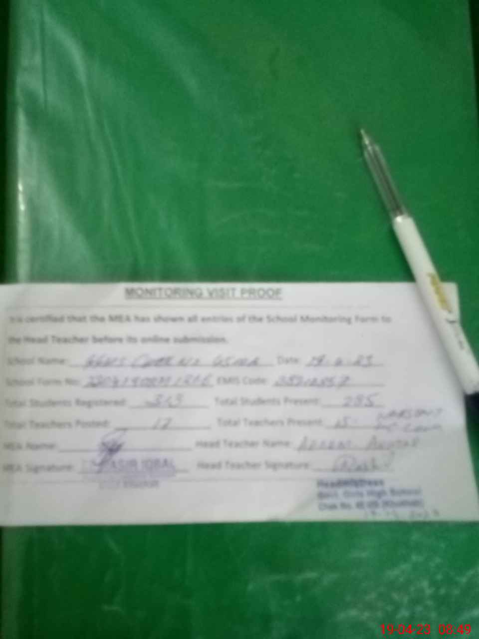 | Attendance Register | Head Teacher | MEA with School | Visit Proof |