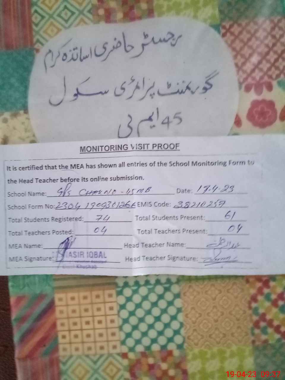 | EMIS Code: 38210257 | Name of School: GPS CHAK NO 45 MB | |||