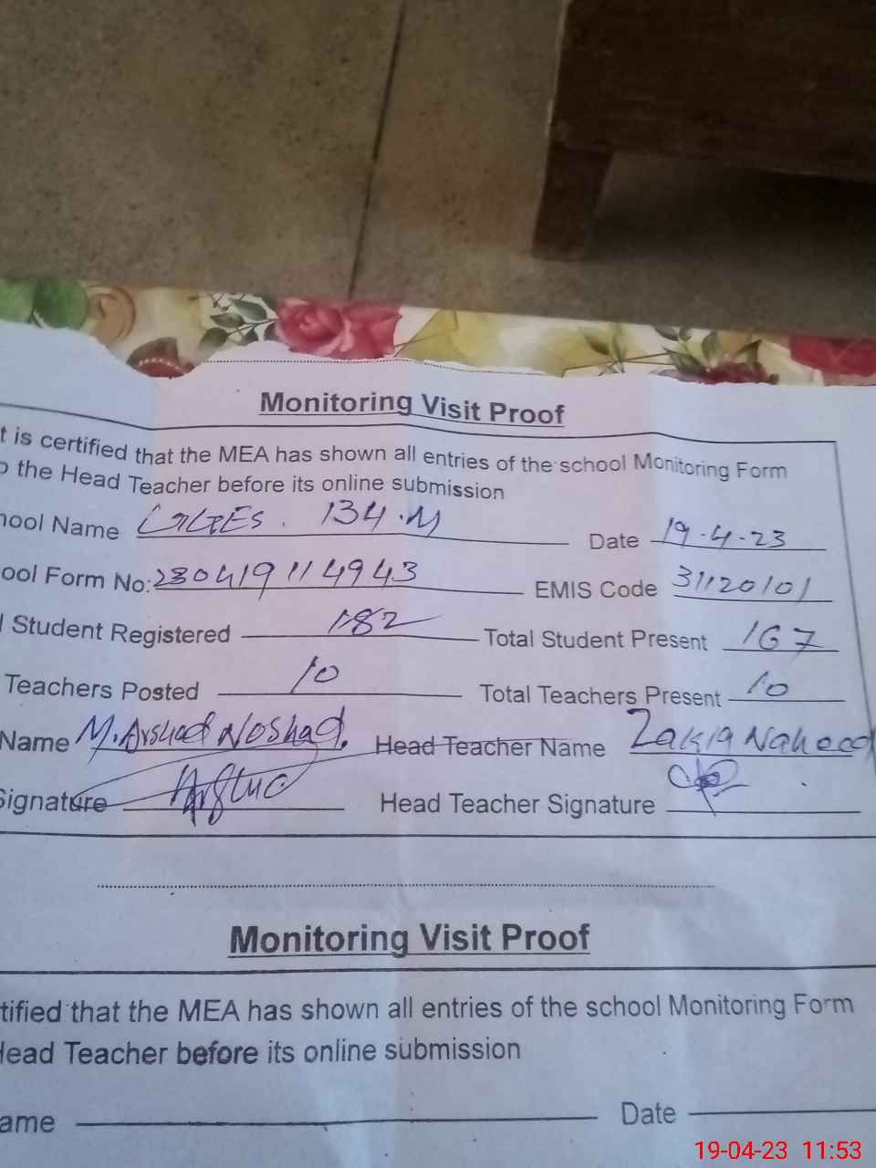 | Attendance Register | Head Teacher | MEA with School | Visit Proof |
