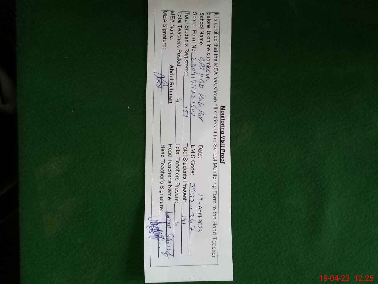 | Attendance Register | Head Teacher | MEA with School | Visit Proof |