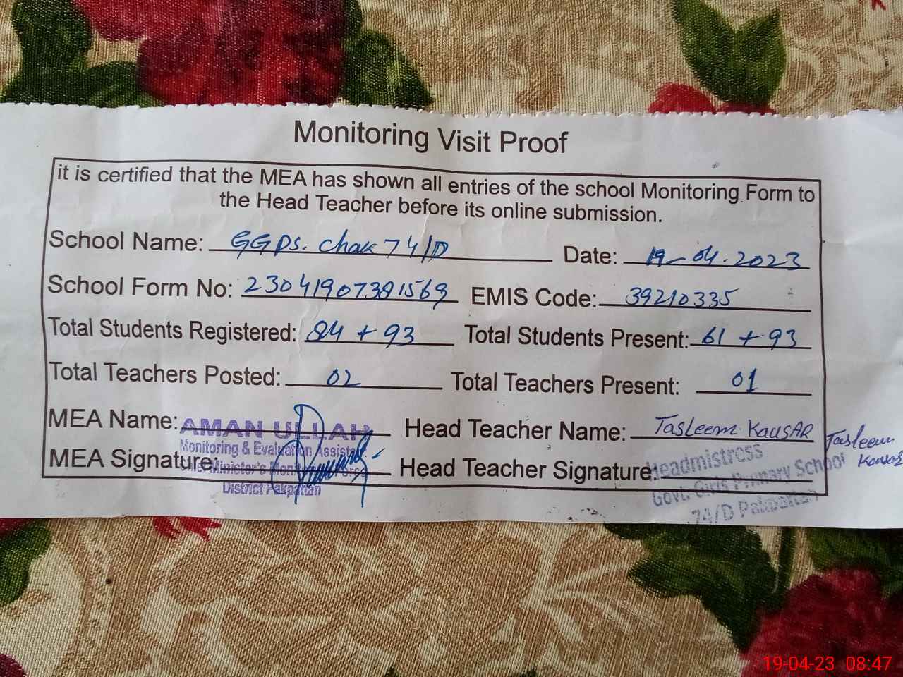| Attendance Register | Head Teacher | MEA with School | Visit Proof |