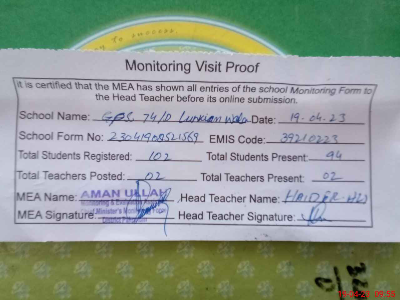 | Attendance Register | Head Teacher | MEA with School | Visit Proof |