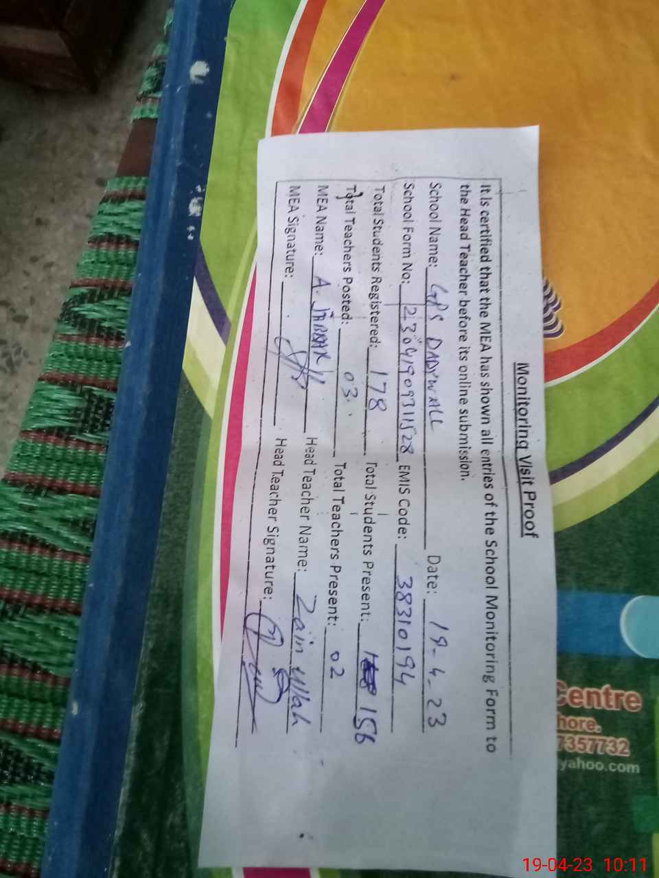 | Attendance Register | Head Teacher | MEA with School | Visit Proof |