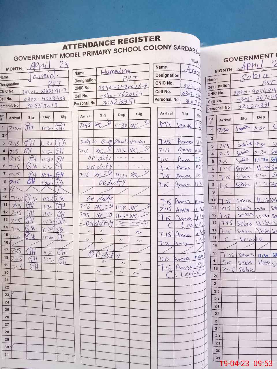 | CNIC | Full Name | Designation | R/C | Absence During Last Calender Month |