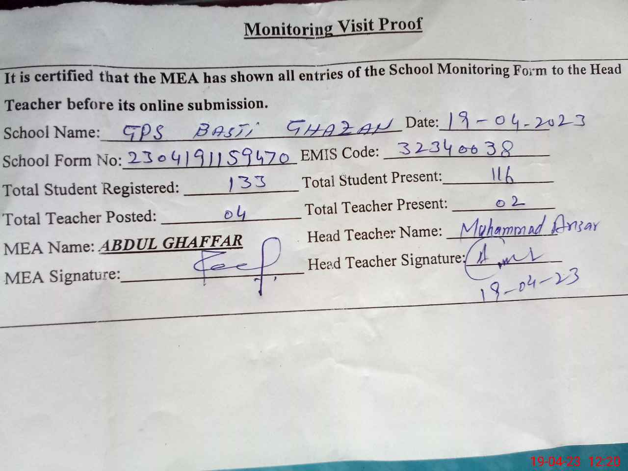 | Attendance Register | Head Teacher | MEA with School | Visit Proof |