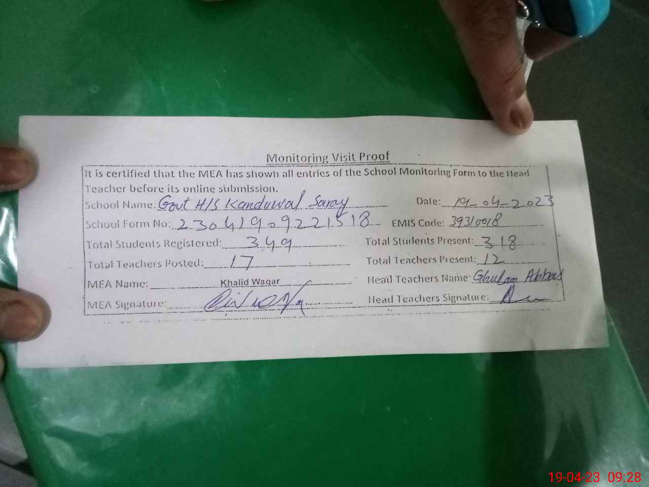 | Attendance Register | Head Teacher | MEA with School | Visit Proof |