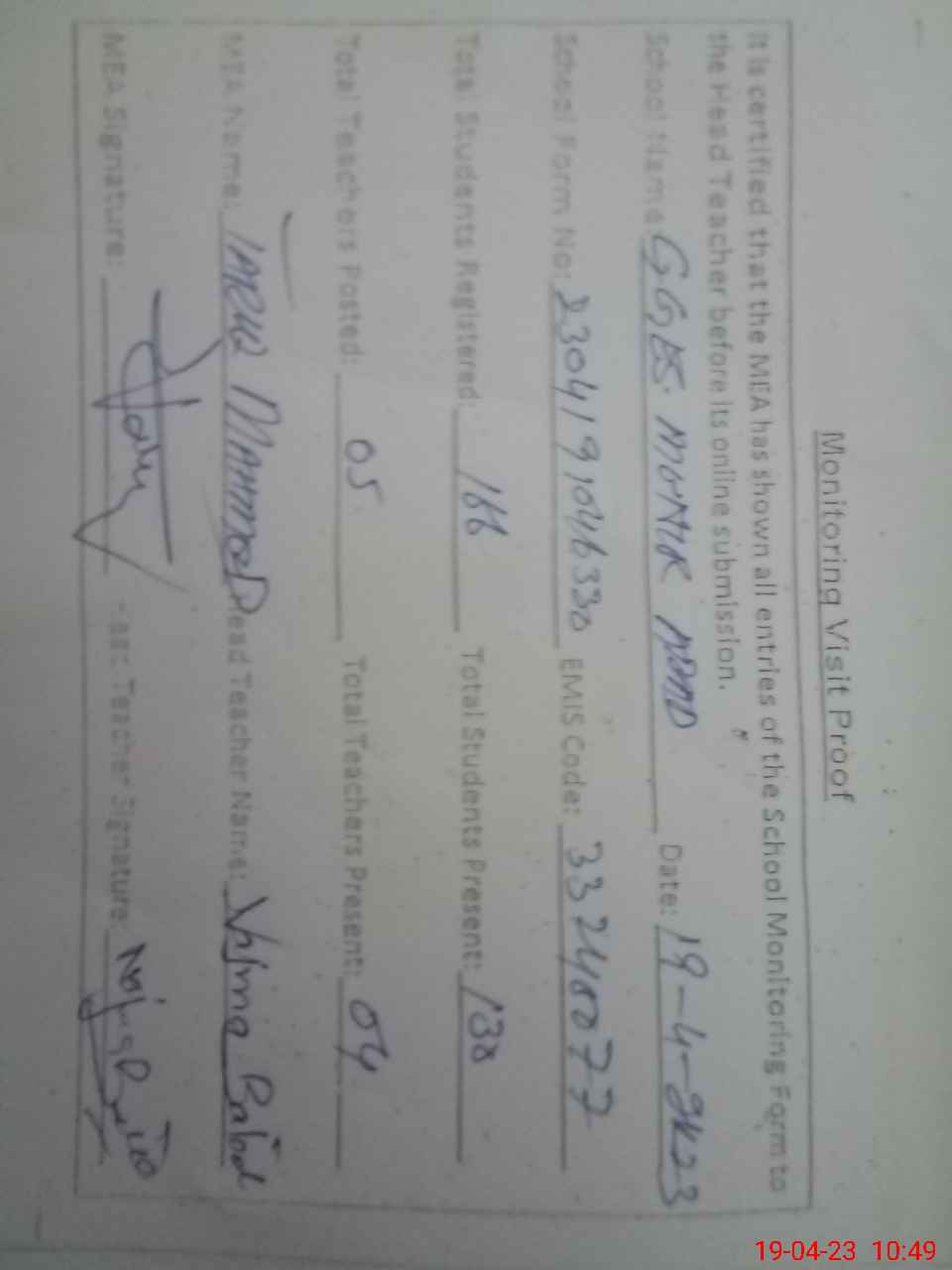 | Certified that this School was Inspected by the Undersigned MEA/DMO Today and the Information Stated Above is as Per Record. | |||||