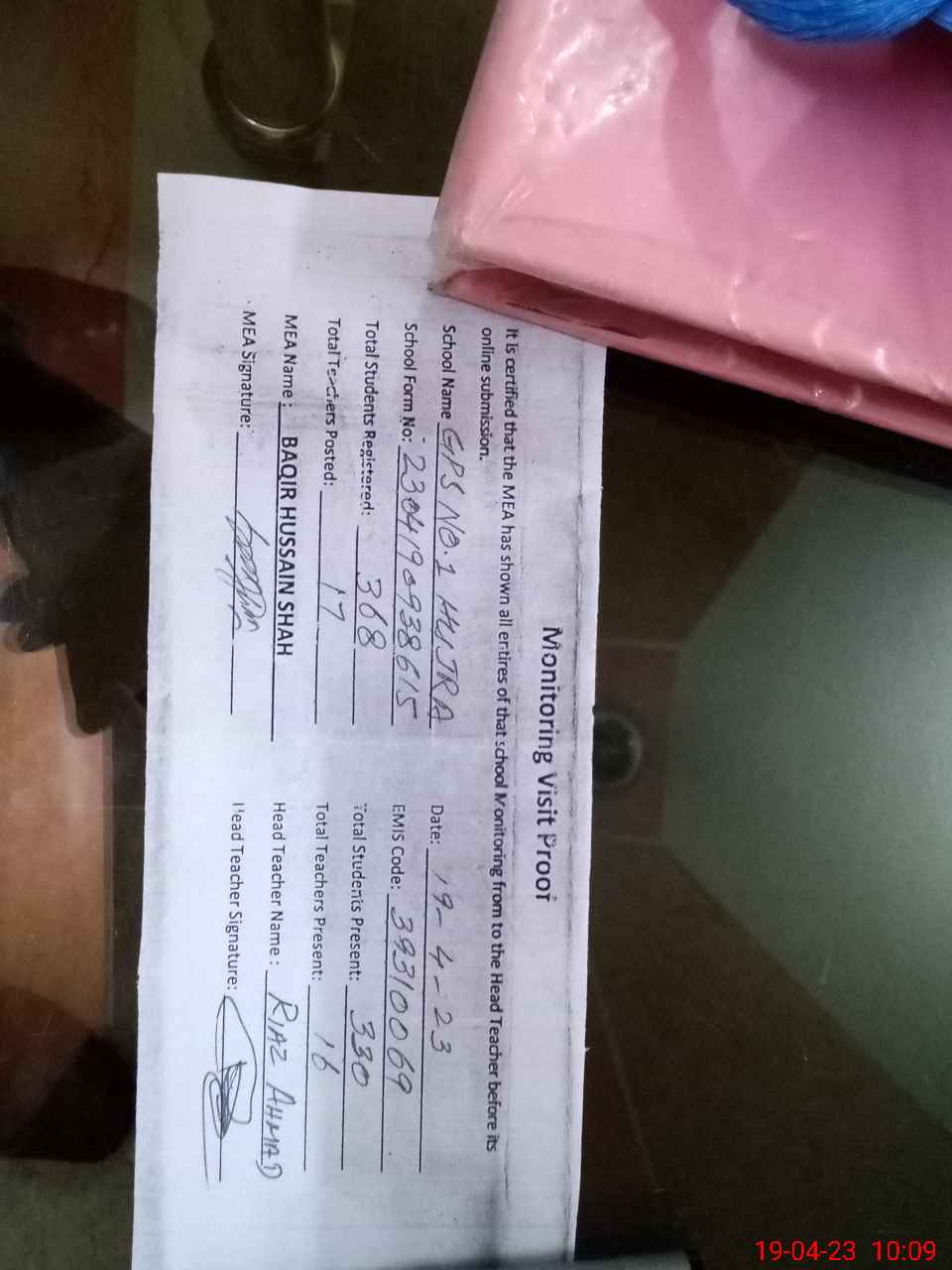 | Attendance Register | Head Teacher | MEA with School | Visit Proof |