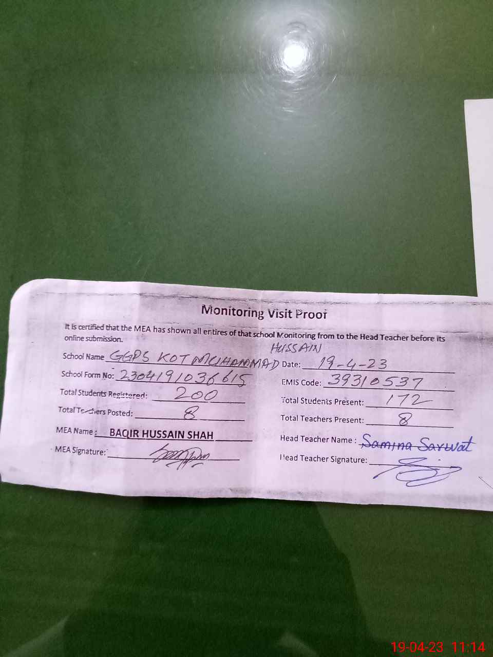 | Attendance Register | Head Teacher | MEA with School | Visit Proof |