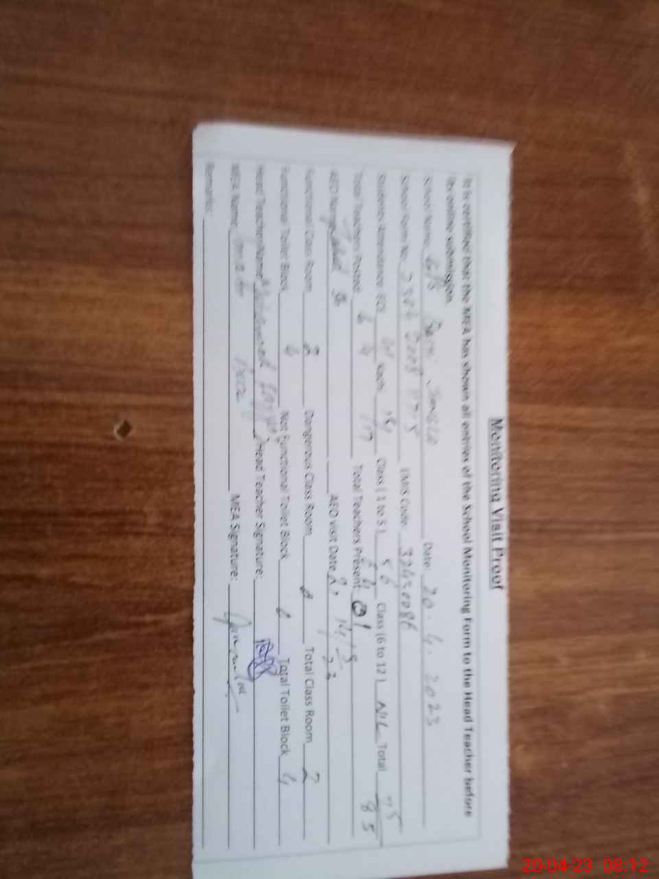 | Attendance Register | Head Teacher | MEA with School | Visit Proof |