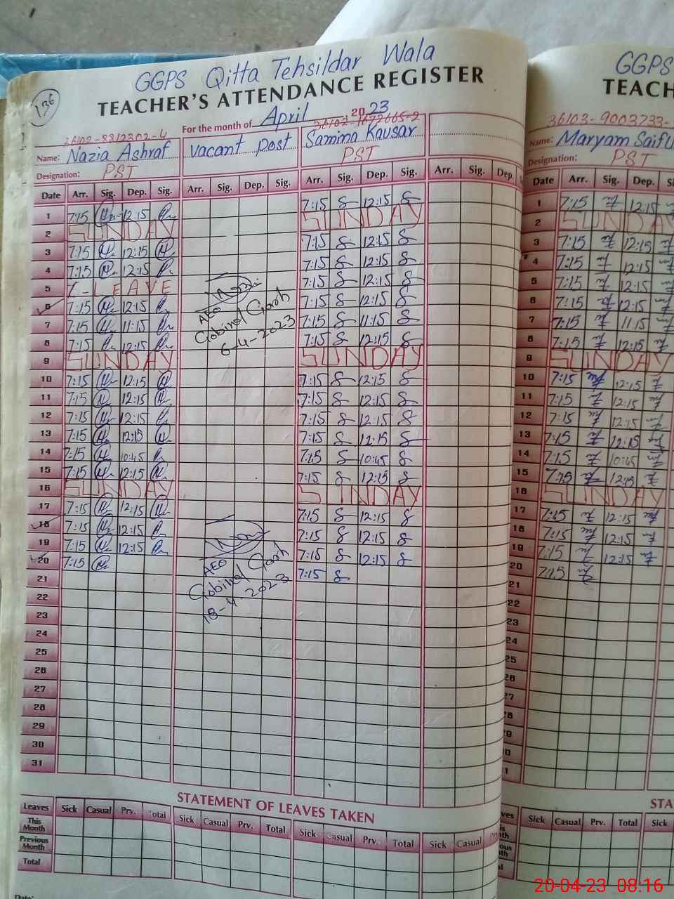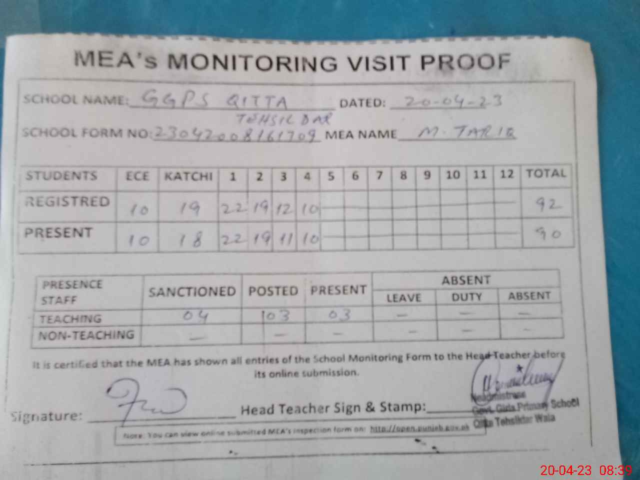| Attendance Register | Head Teacher | MEA with School | Visit Proof |