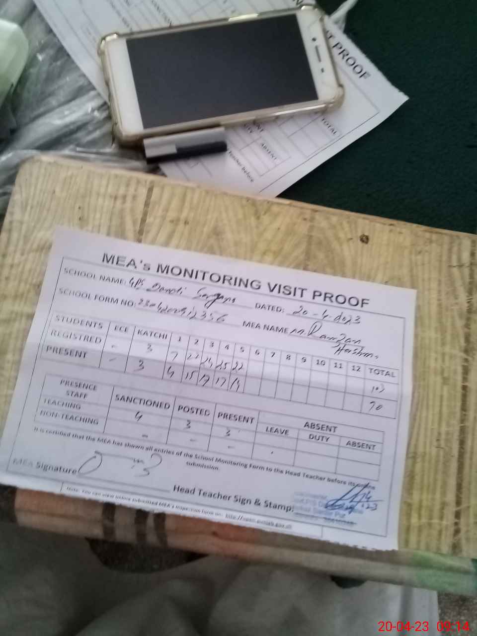 | Attendance Register | Head Teacher | MEA with School | Visit Proof |