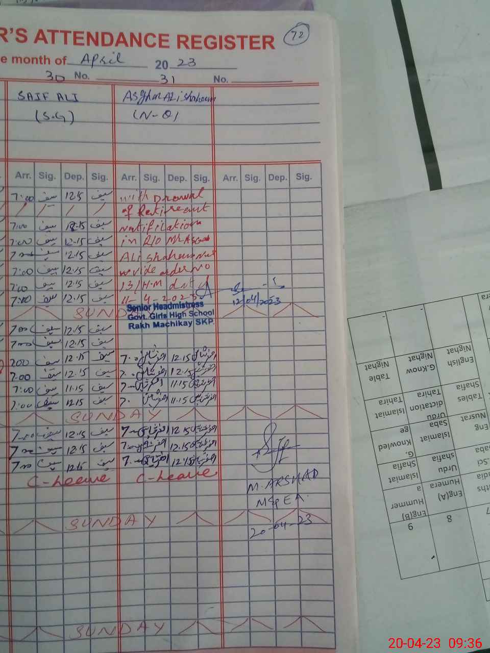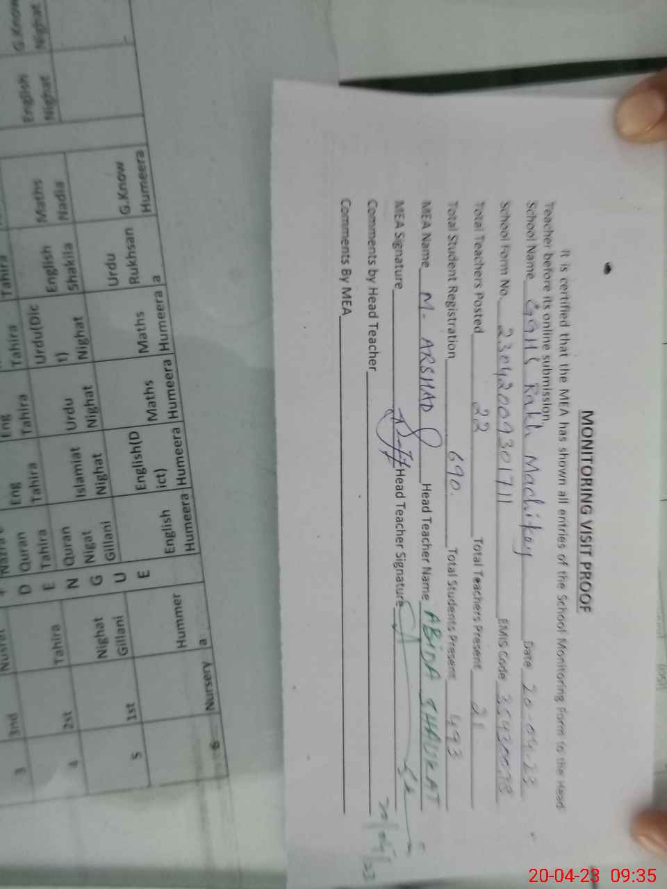 | Attendance Register | Head Teacher | MEA with School | Visit Proof |