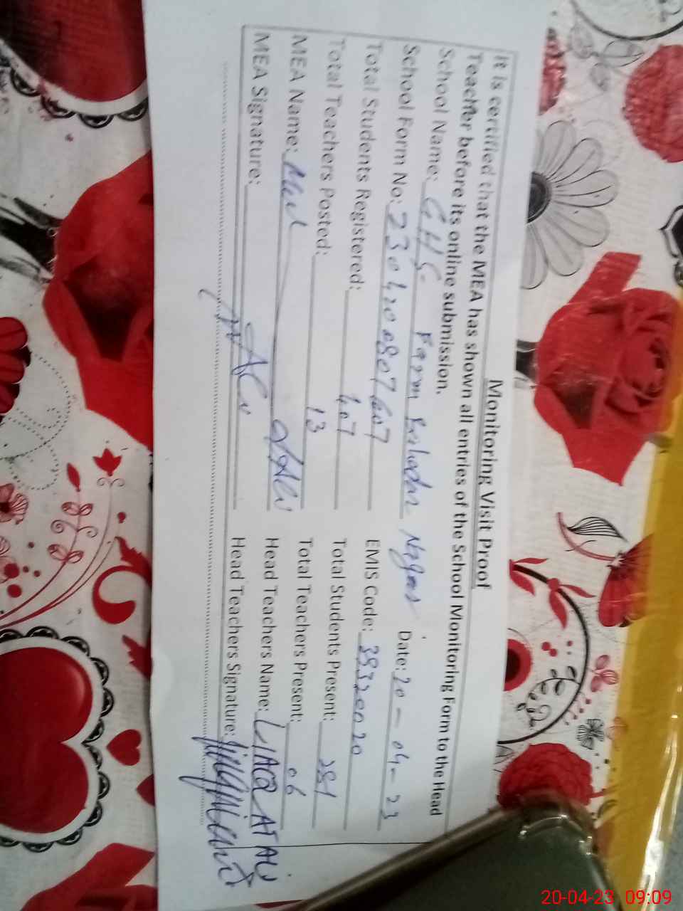 | Attendance Register | Head Teacher | MEA with School | Visit Proof |