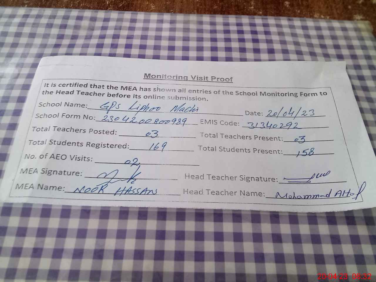 | Attendance Register | Head Teacher | MEA with School | Visit Proof |