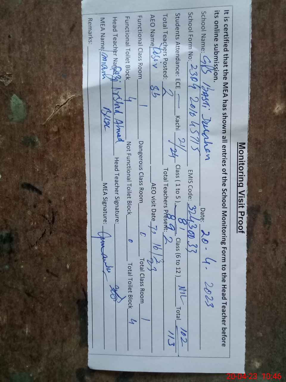 | Attendance Register | Head Teacher | MEA with School | Visit Proof |