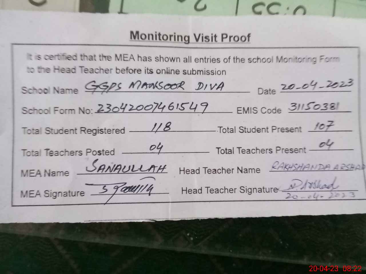 | EMIS Code: 31150381 | Name of School: GGPS MANSOOR DIVA | |||