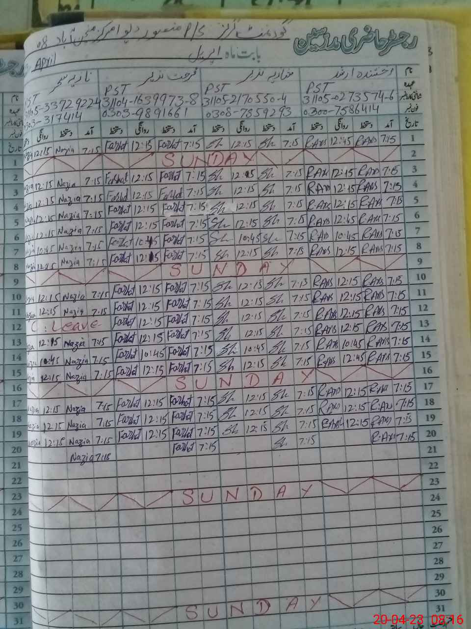 | CNIC | Full Name | Designation | R/C | Absence During Last Calender Month |