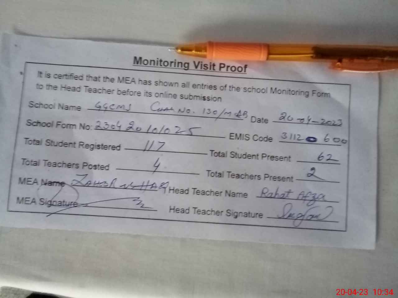| Attendance Register | Head Teacher | MEA with School | Visit Proof |