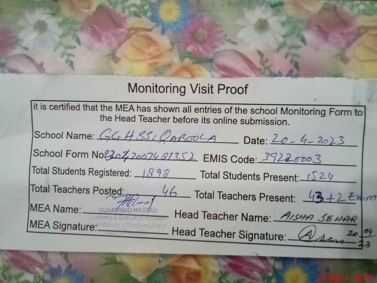 | Attendance Register | Head Teacher | MEA with School | Visit Proof |