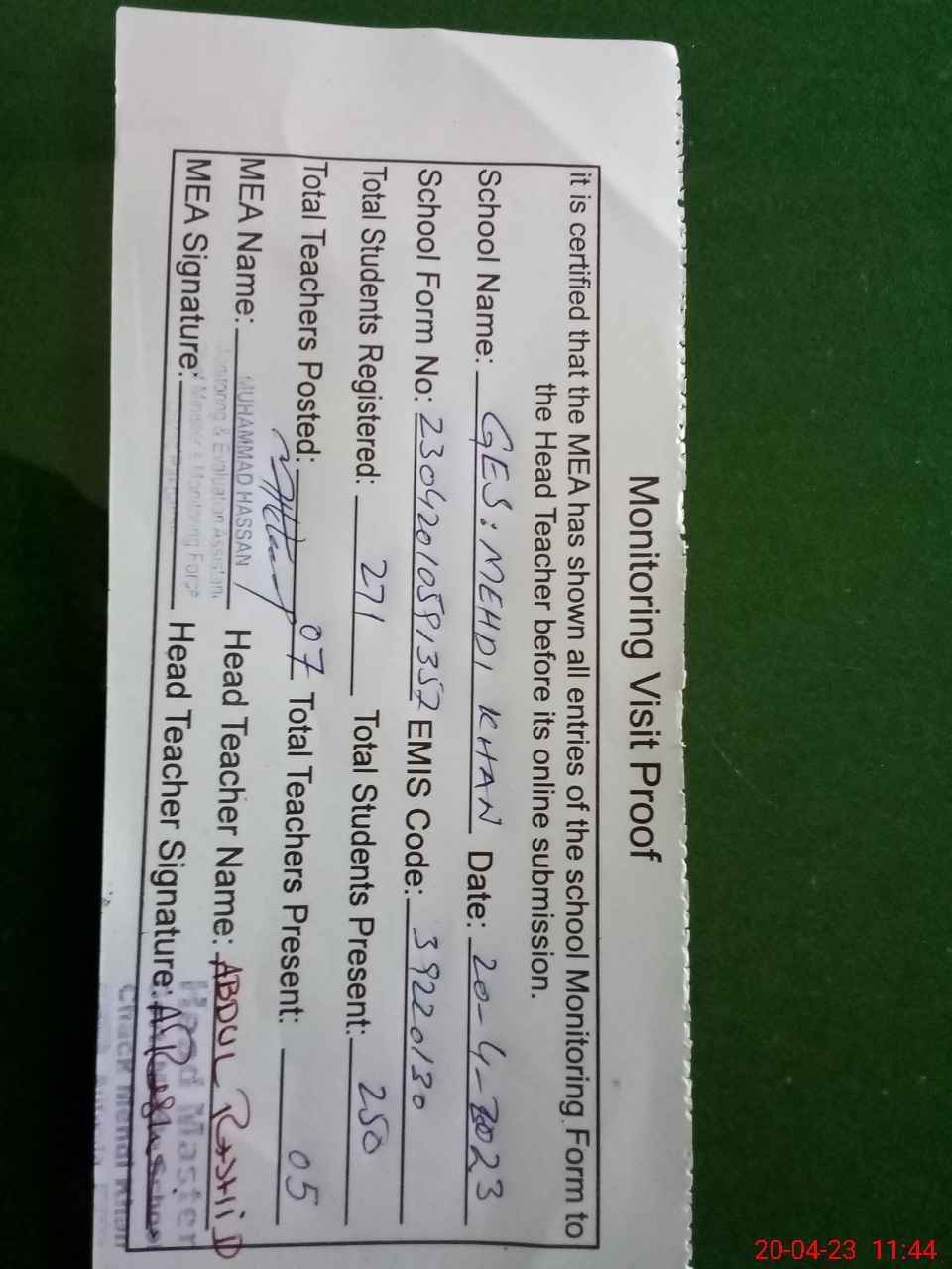 | EMIS Code: 39220130 | Name of School: GES MEHDI KHAN | |||