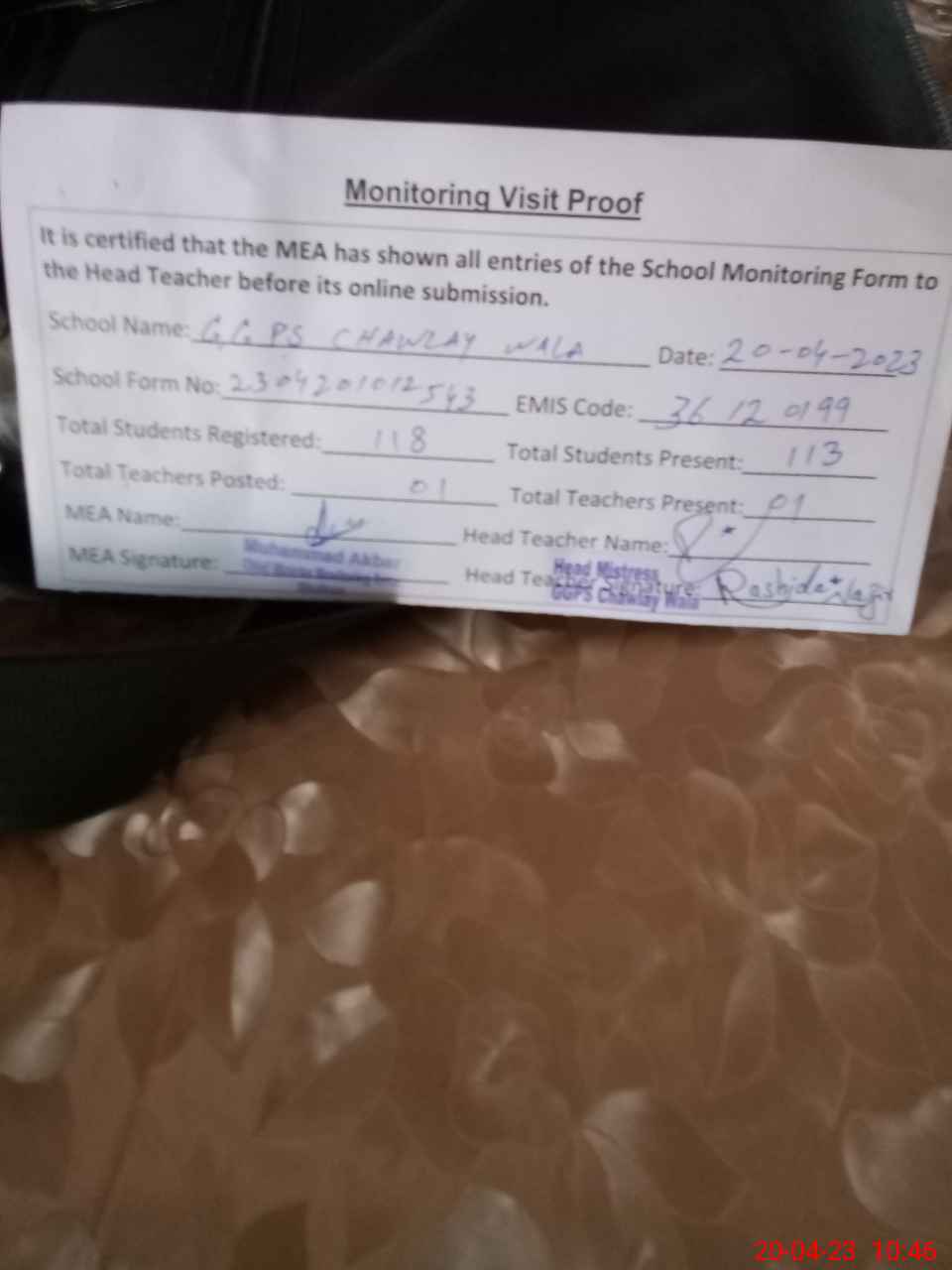 | Attendance Register | Head Teacher | MEA with School | Visit Proof |
