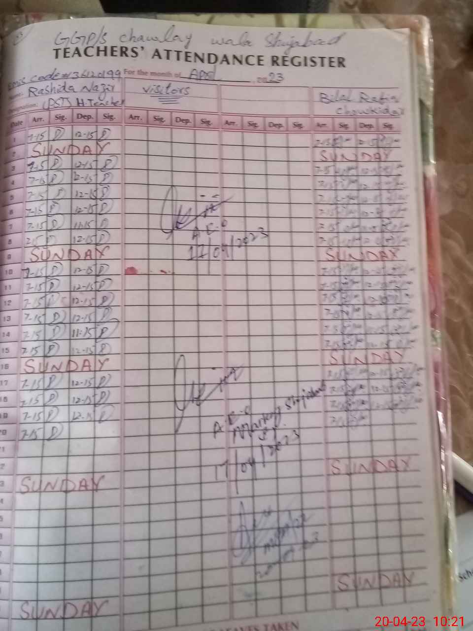| School Visited by School Health & Nutrition Supervisor (No. of Visits) | Name1: | Fozia Bano | Name2: | ||