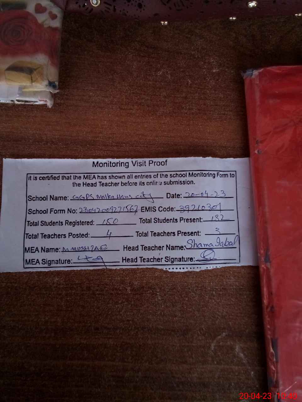 | Attendance Register | Head Teacher | MEA with School | Visit Proof |