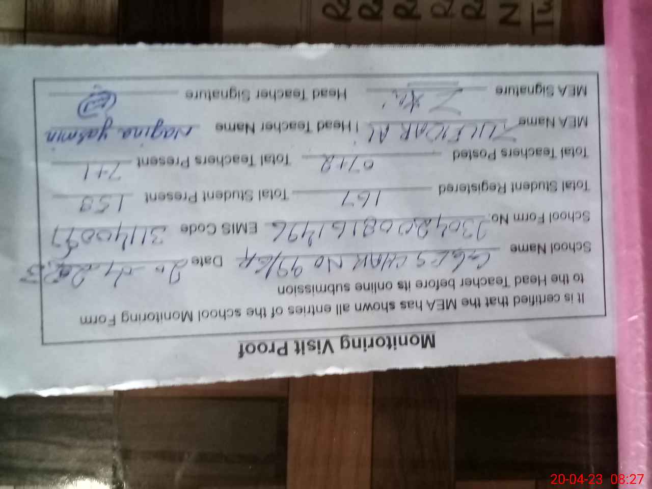 | Attendance Register | Head Teacher | MEA with School | Visit Proof |