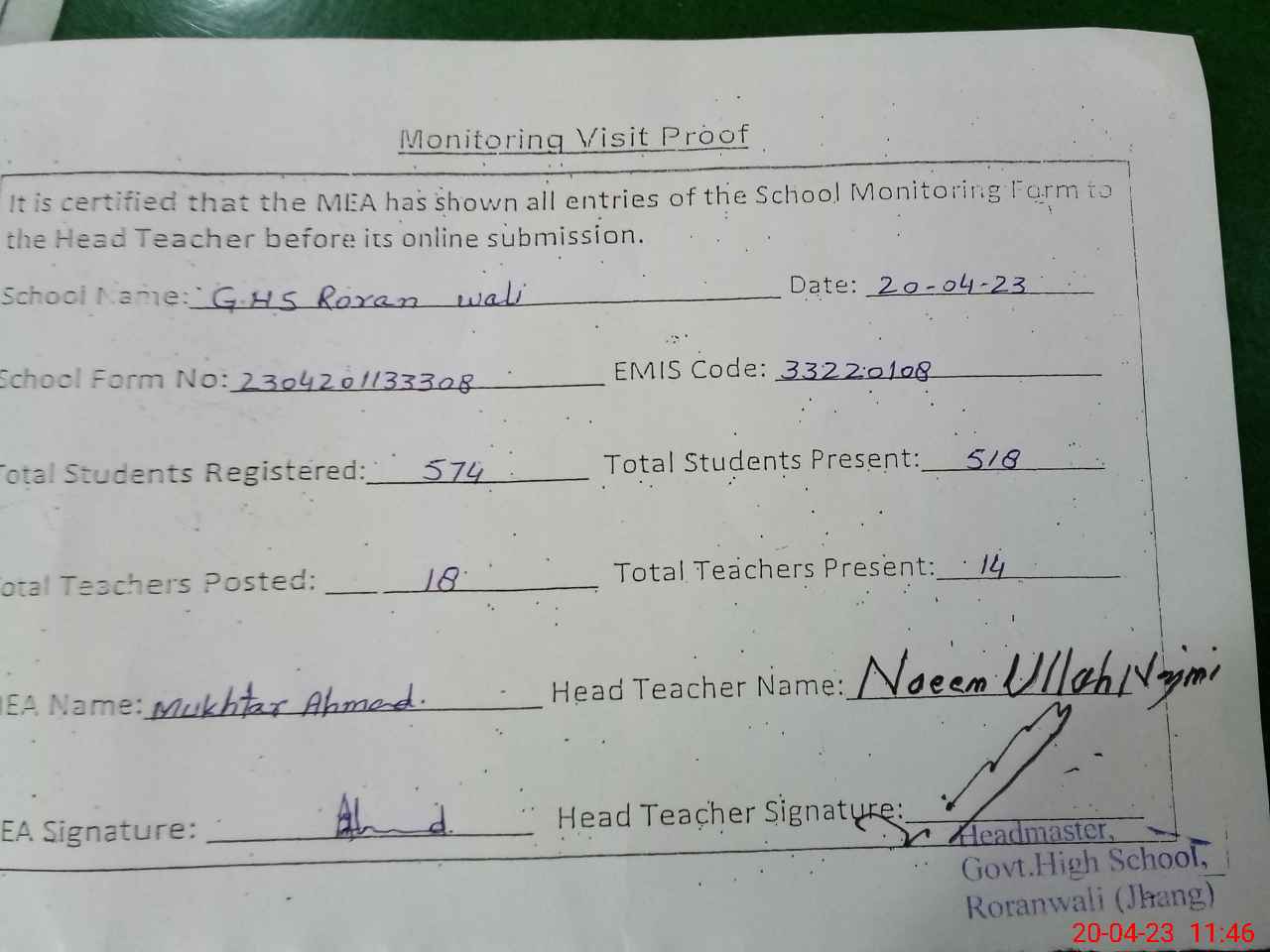 | Attendance Register | Head Teacher | MEA with School | Visit Proof |
