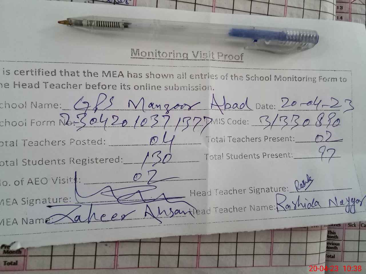 | Monitoring Date: 20-04-2023 | Start Time: 20-04-2023 10:04 AM | End Time: 20-04-2023 10:43 AM | Name of MEA: Za**** Ah**** | |