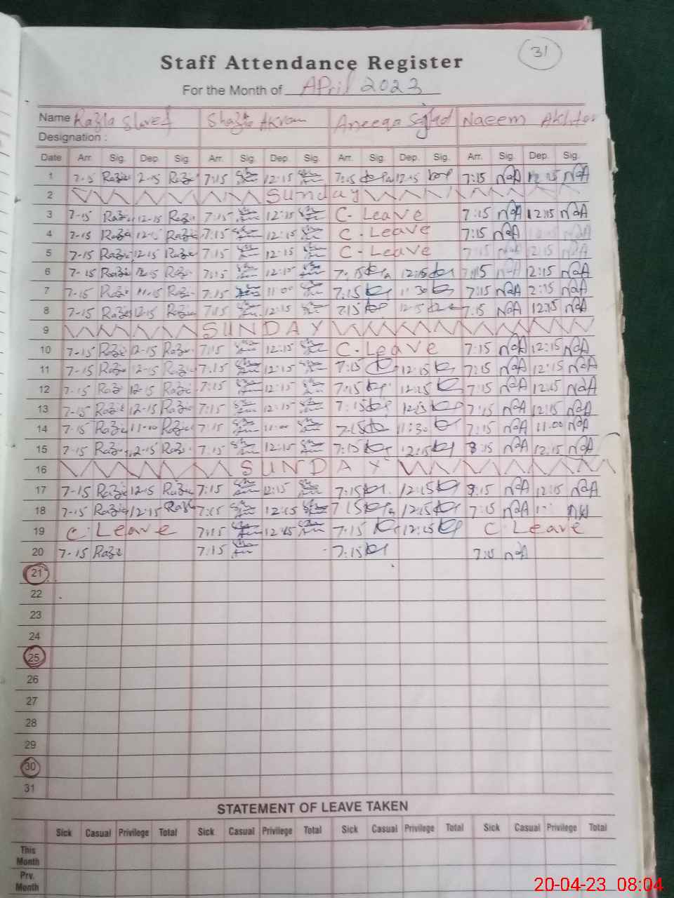 | CNIC | Full Name | Designation | R/C | Absence During Last Calender Month |
