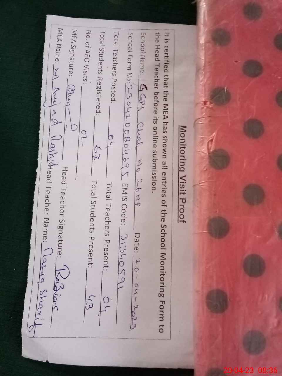| Attendance Register | Head Teacher | MEA with School | Visit Proof |