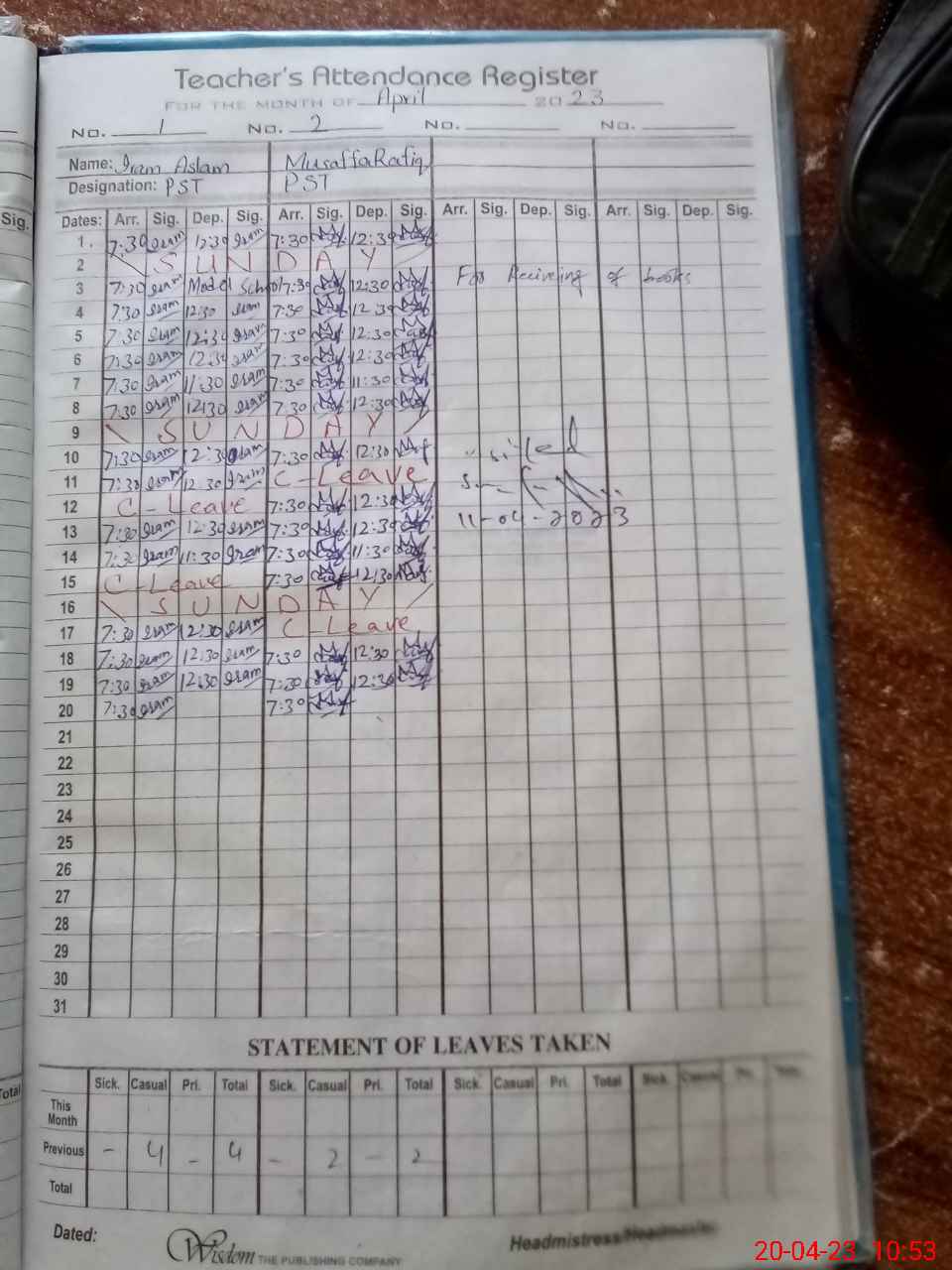 | Name: IR**** AS**** Designation: (School Headmaster's/Headmistress's) PST Phone/Cell Number: 03**** |