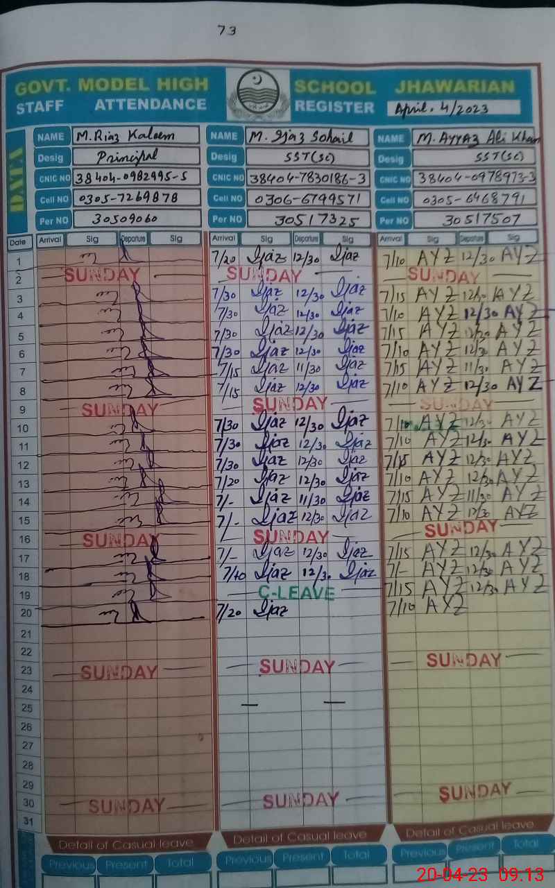 | CNIC | Full Name | Designation | R/C | Absence During Last Calender Month |