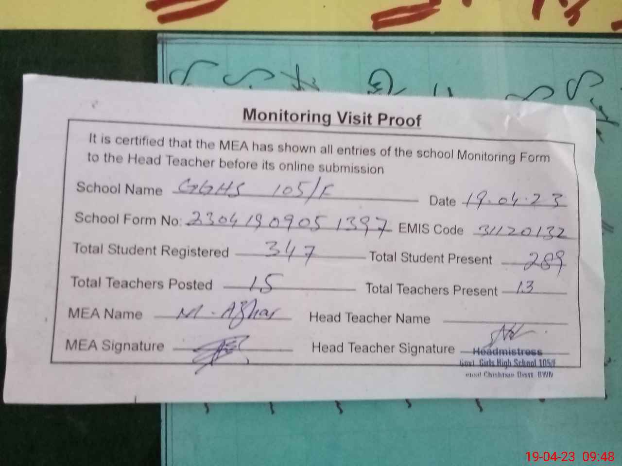 | Attendance Register | Head Teacher | MEA with School | Visit Proof |