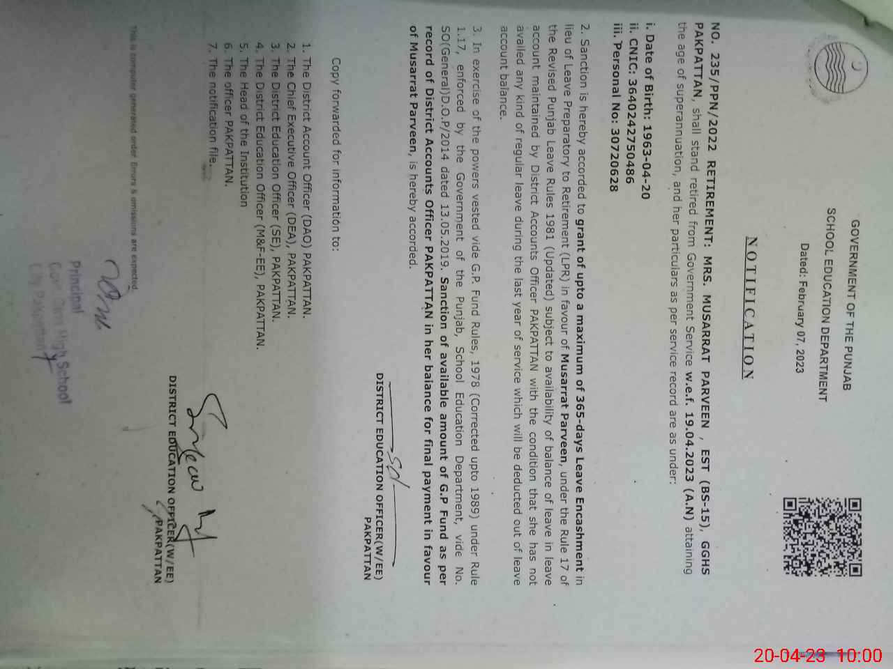 | Name: Nu**** Na**** Designation: (School Headmaster's/Headmistress's) Princeple Phone/Cell Number: 03**** |