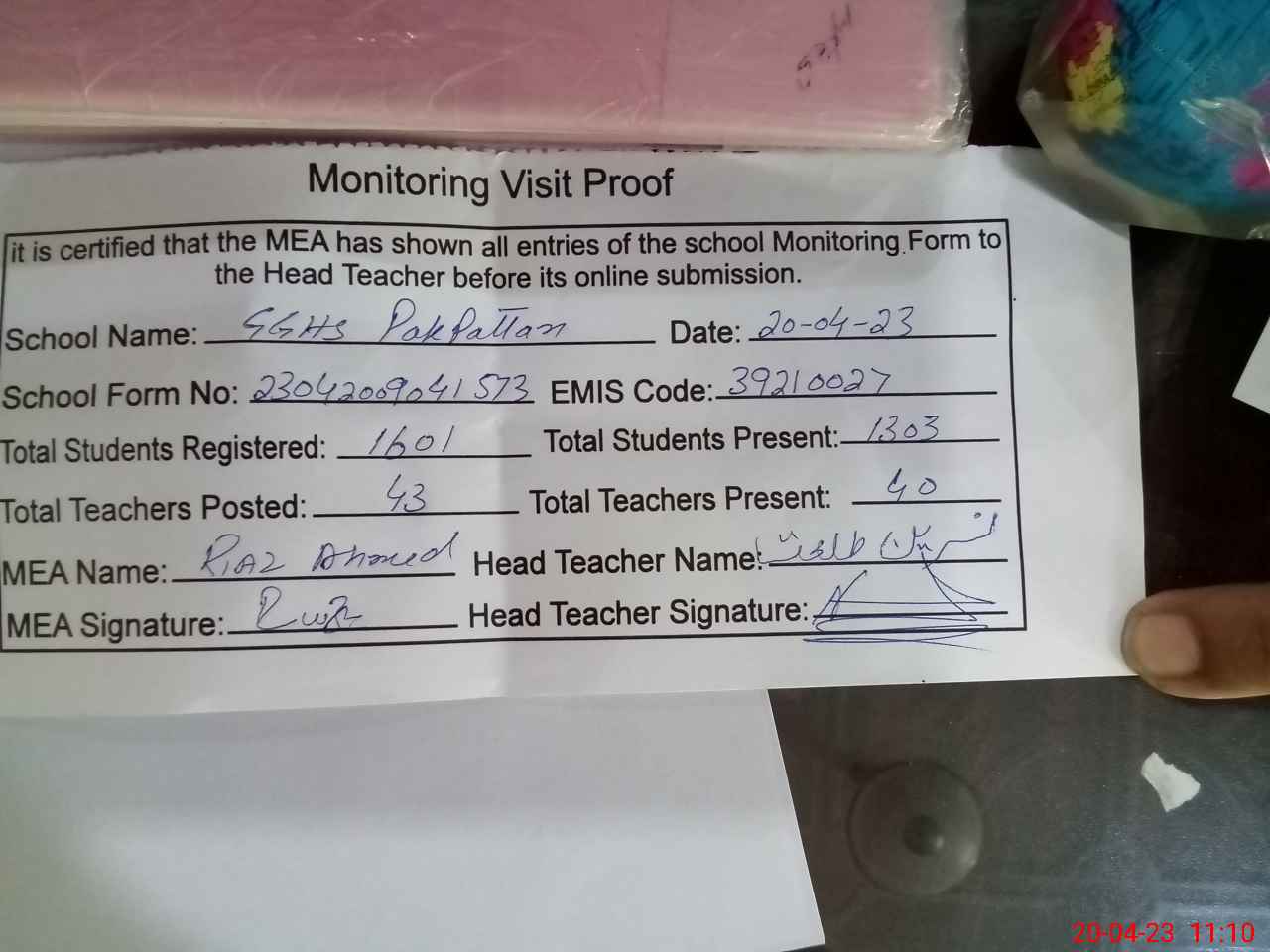 | Attendance Register | Head Teacher | MEA with School | Visit Proof |
