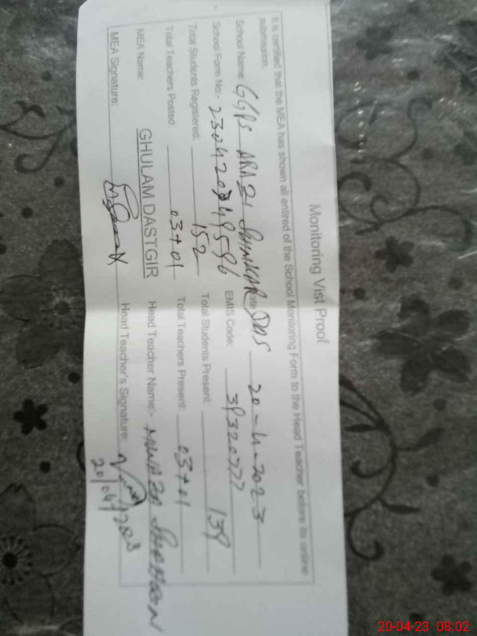 | Monitoring Date: 20-04-2023 | Start Time: 20-04-2023 07:48 AM | End Time: 20-04-2023 08:11 AM | Name of MEA: GH**** DA**** (R**** | |