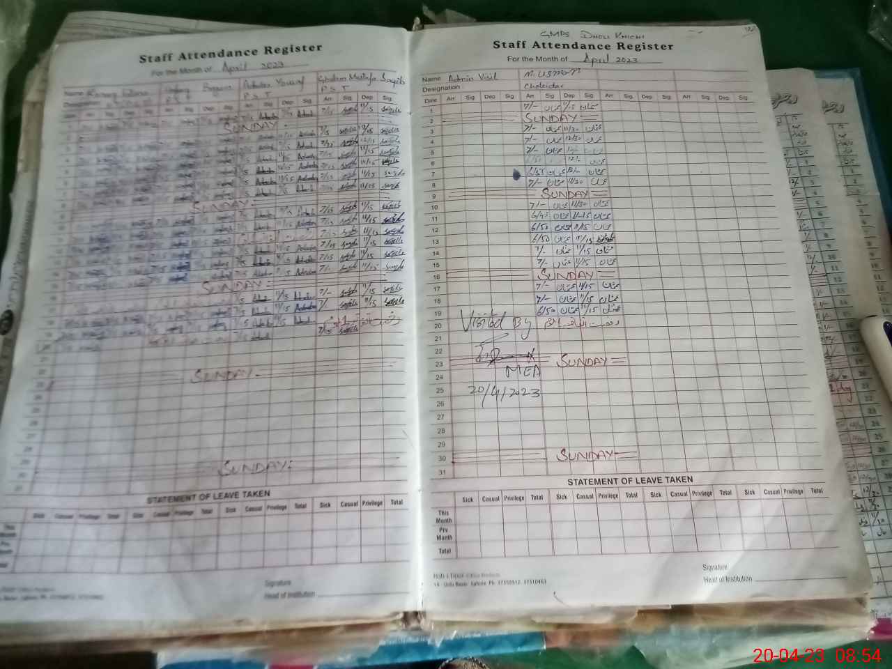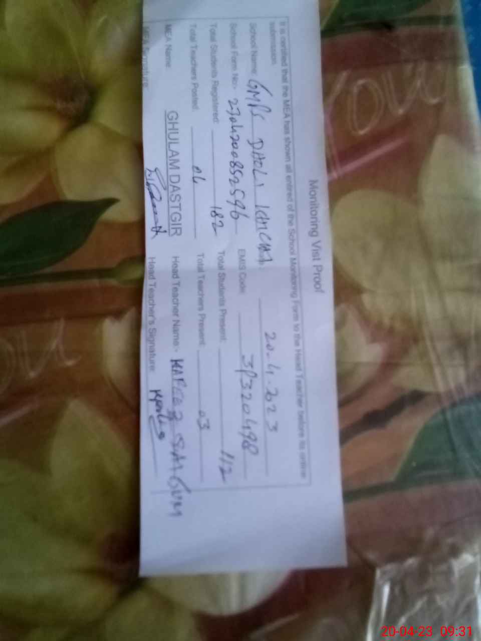 | Attendance Register | Head Teacher | MEA with School | Visit Proof |